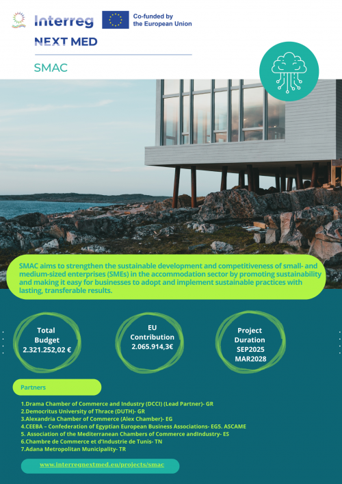 SMAC – Sustainability Model for Accommodation MSMEs is an ambitious transnational project funded by the Interreg NEXT MED Programme. Coordinated by the Chamber of Drama (Greece), the project brings together seven partners from Greece, Spain, Egypt, Tunisia, and Türkiye to help small accommodation enterprises transition towards sustainability.